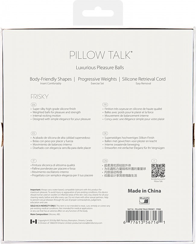 Шарики Pillow Talk — Frisky Pink с кристаллами Swarovski повышает сексуальное удовольствие и укрепляет вагинальные мышцы. Шикарный шелковистый силикон и ослепительные кристаллы Сваровски делают шарики не просто полезным девайсом, но и лакшери-аксессуаром. Набор из одинарного и двойных шариков со смещенным центром тяжести позволяет тщательно проработать глубокие мышцы. Шарики разного размера для максимальной эффективности.